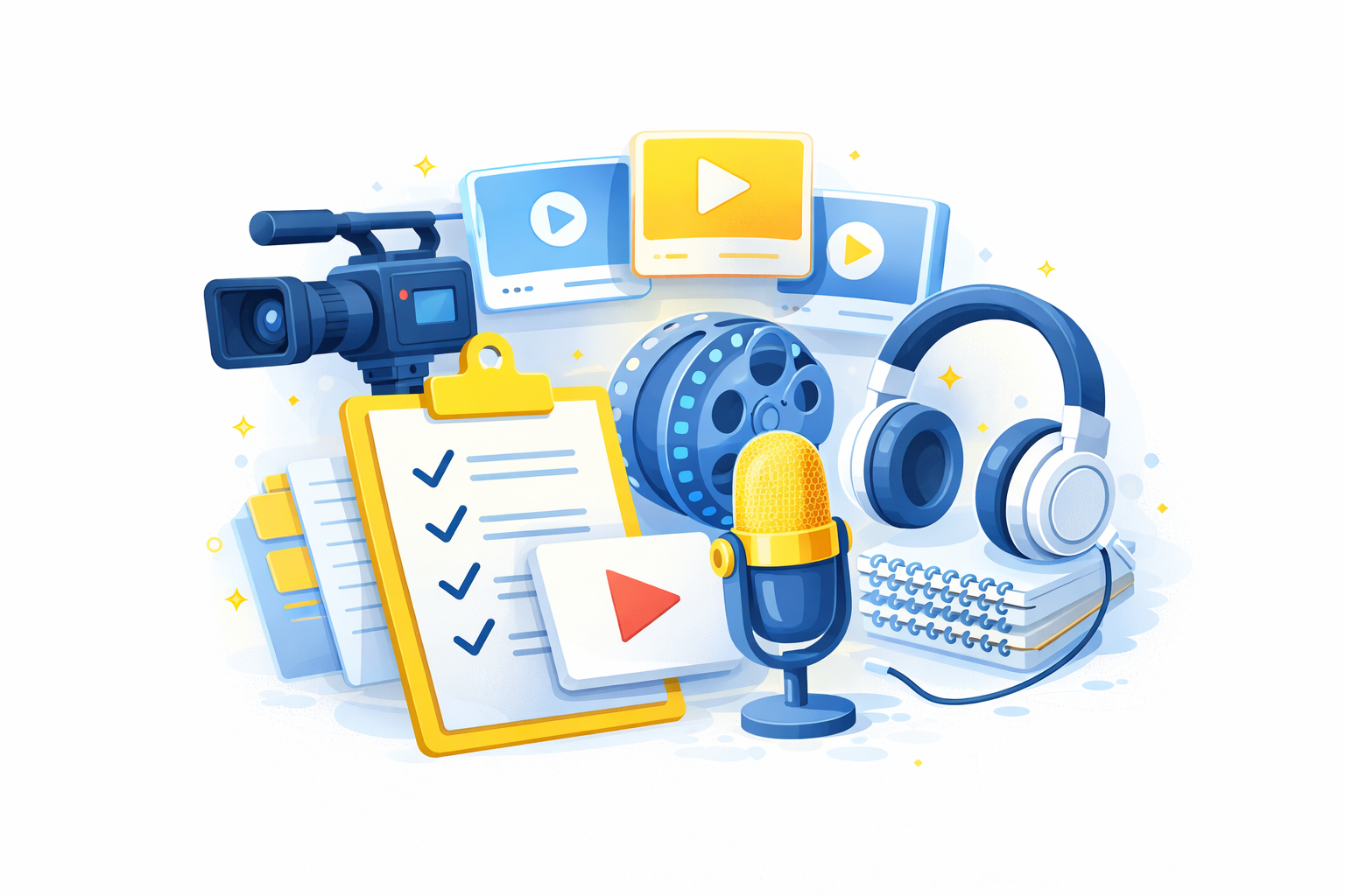 Script, felvétel, vágás, publikálás, menedzsment.